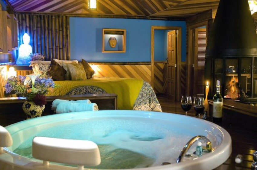 Chalé com banheira de hidro individual no mezanino, com vista para o jardim, cama king size, travesseiros king, roupões, lençol térmico, ar Condicionado, secador de cabelo, TV 32”/Sky, frigobar e varanda.